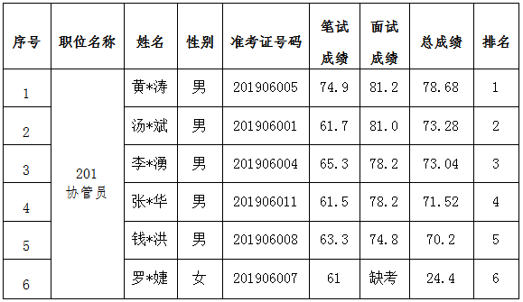 根据《乐动在线注册招聘劳务派遣人员公告》及《乐动在线注册招聘劳务派遣人员的补充公告》要求及相关规定,龙岩市公共资源交易中心有限公司委托中国海峡人才市场龙岩分部于2019年6月23日组织协管员岗位应聘人员进行面试,现将面试成绩及总成绩(笔试占40%,面试占60%)公示如下: